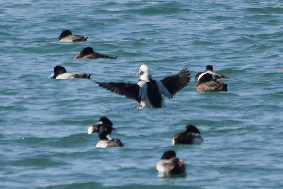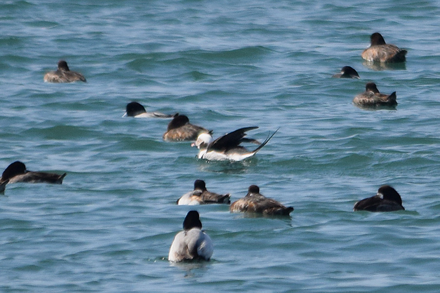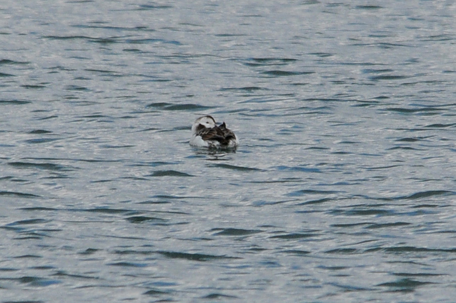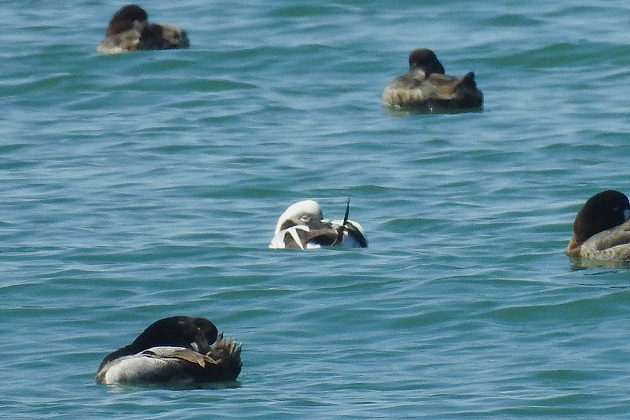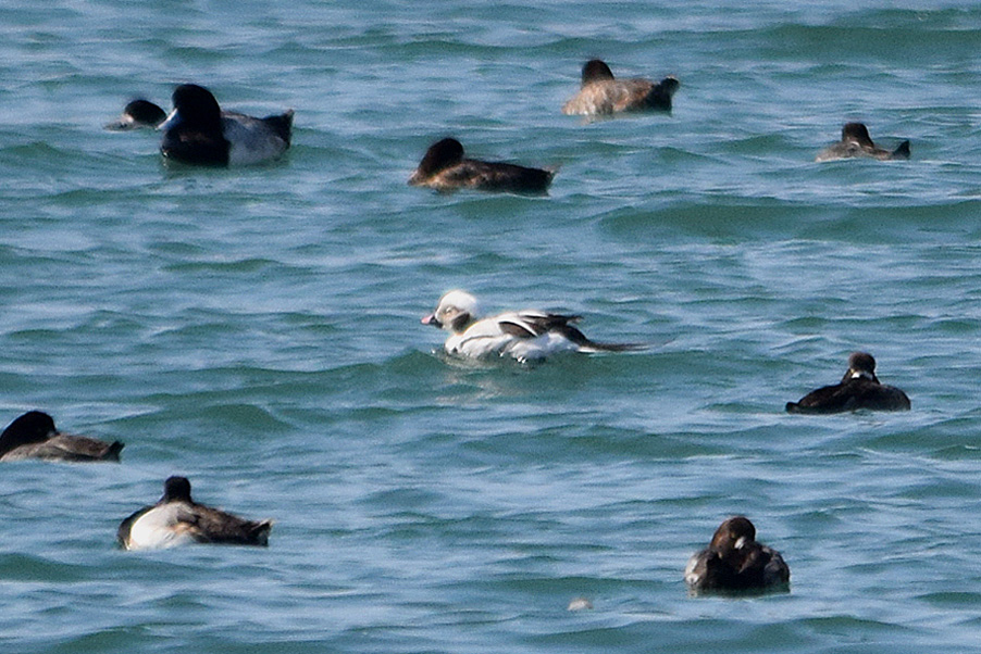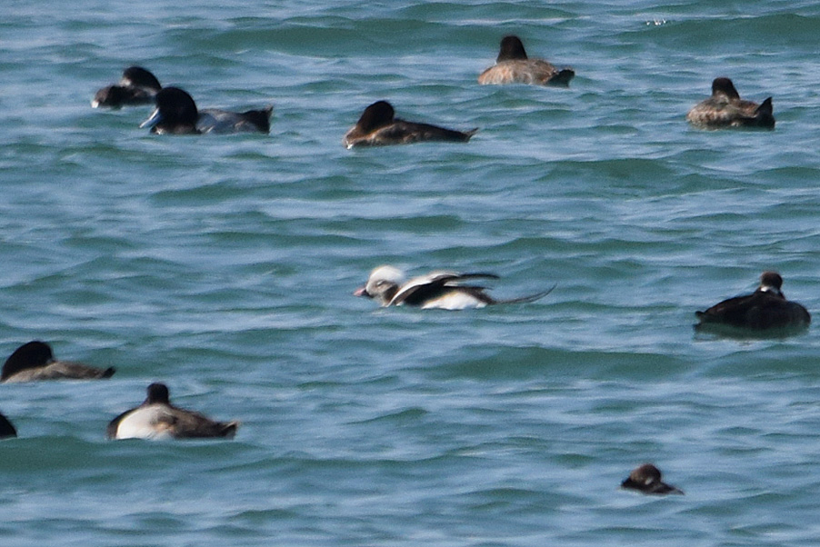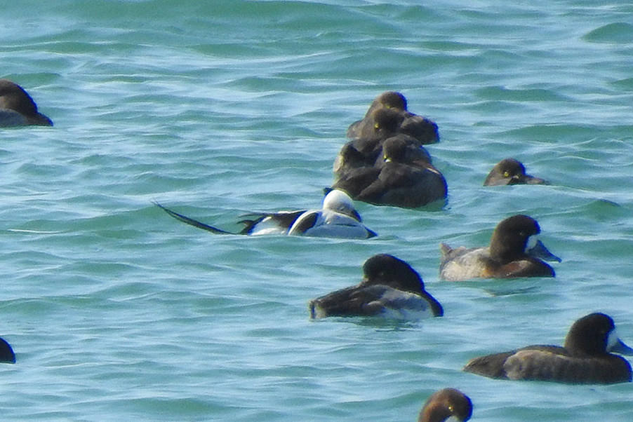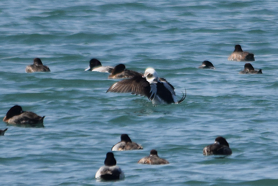 類 似 種:オナガガモの雄も尖った長い尾を持つが、静かな岸近くの海や内陸の湖沼におり、頭部が黒褐色で胸が白い。