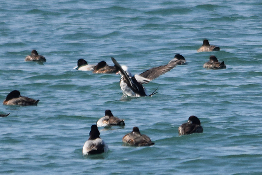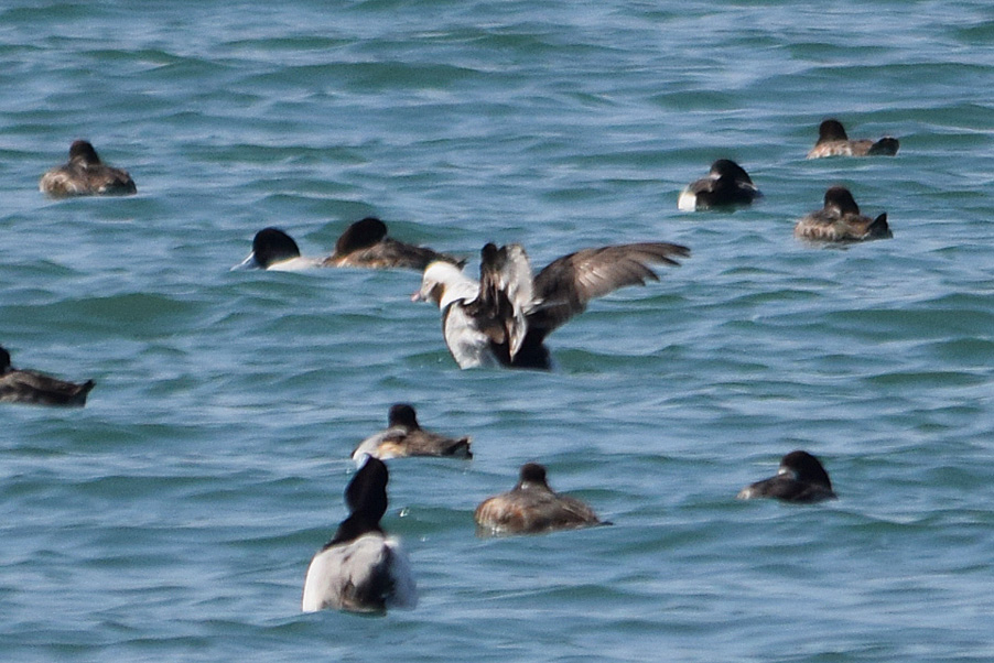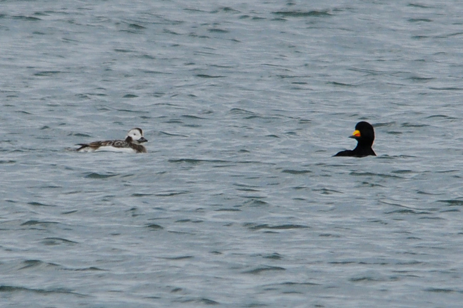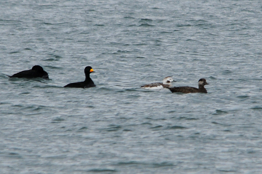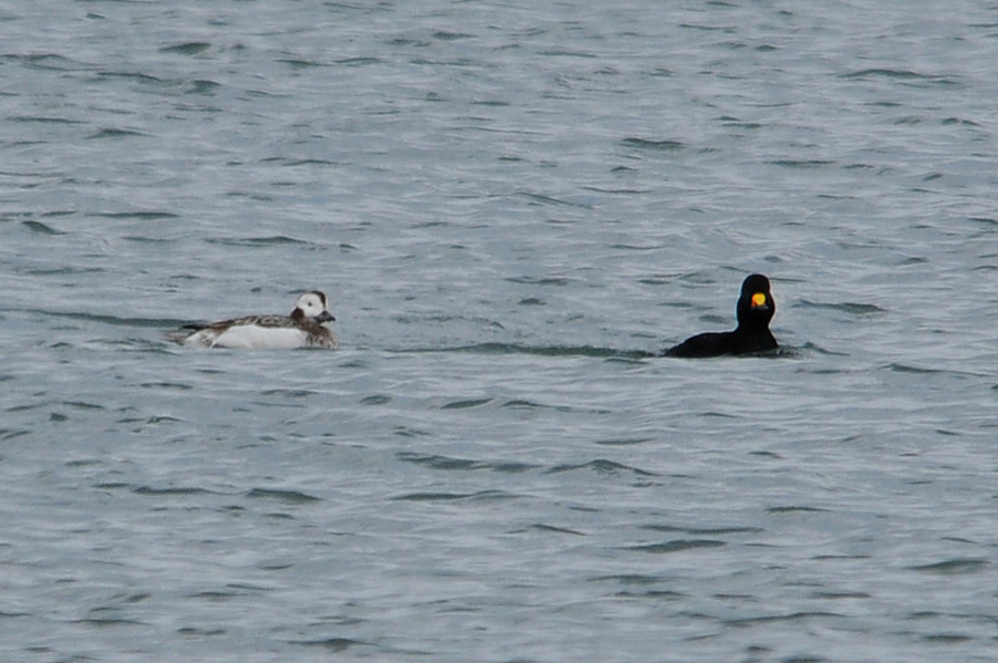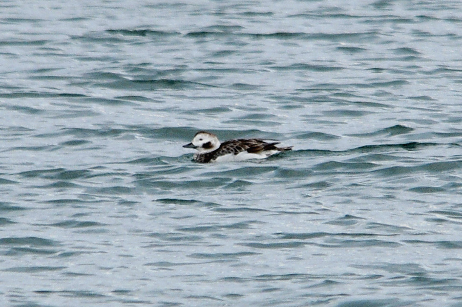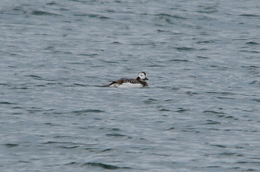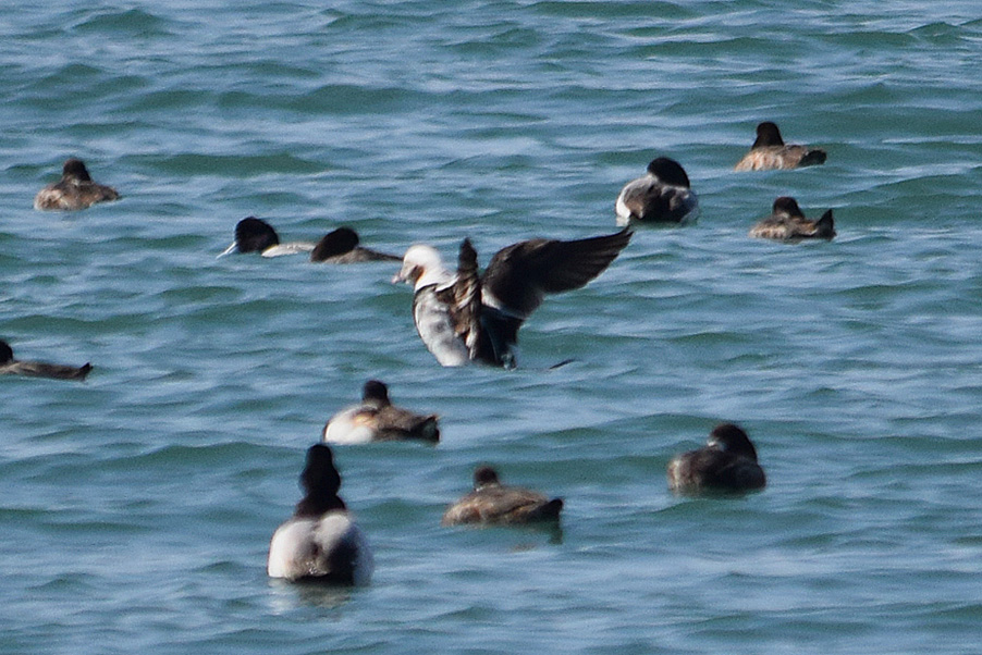 類 似 種:オナガガモの雄も尖った長い尾を持つが、静かな岸近くの海や内陸の湖沼におり、頭部が黒褐色で胸が白い。