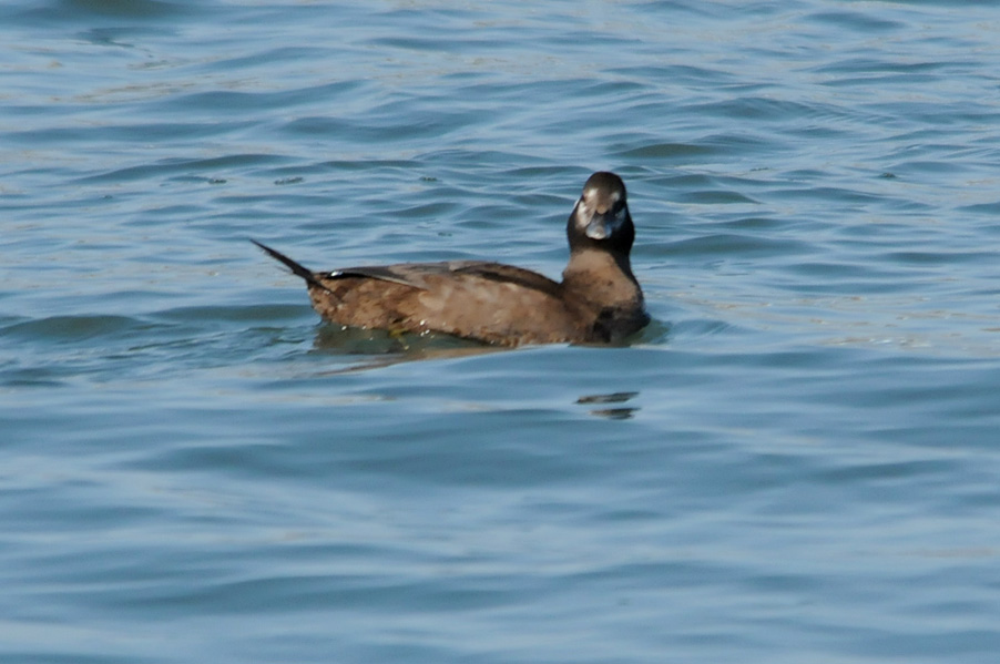 だけが淡く見える。ビロードキンクロの雌は大きくて嘴も永く、その基部は厚い。顔の淡色斑が2個あり、次列風切は白い。アラナ