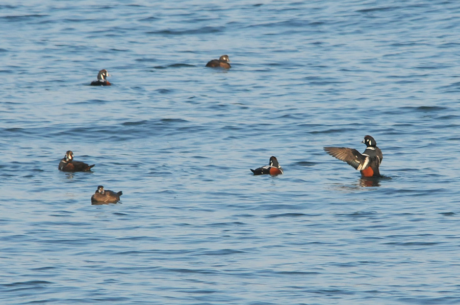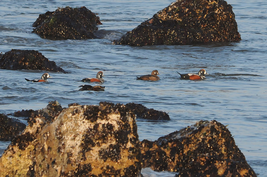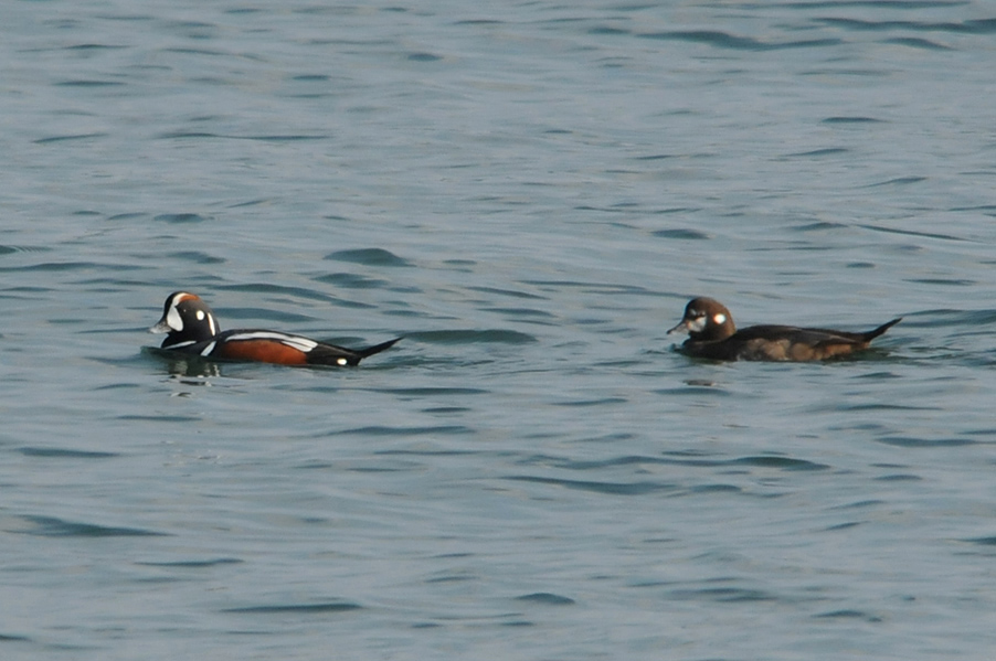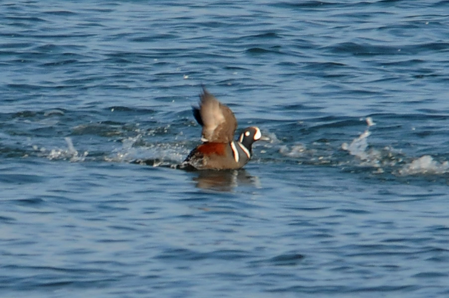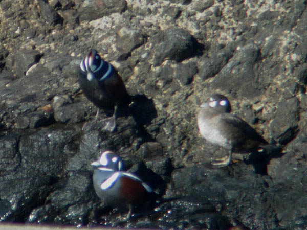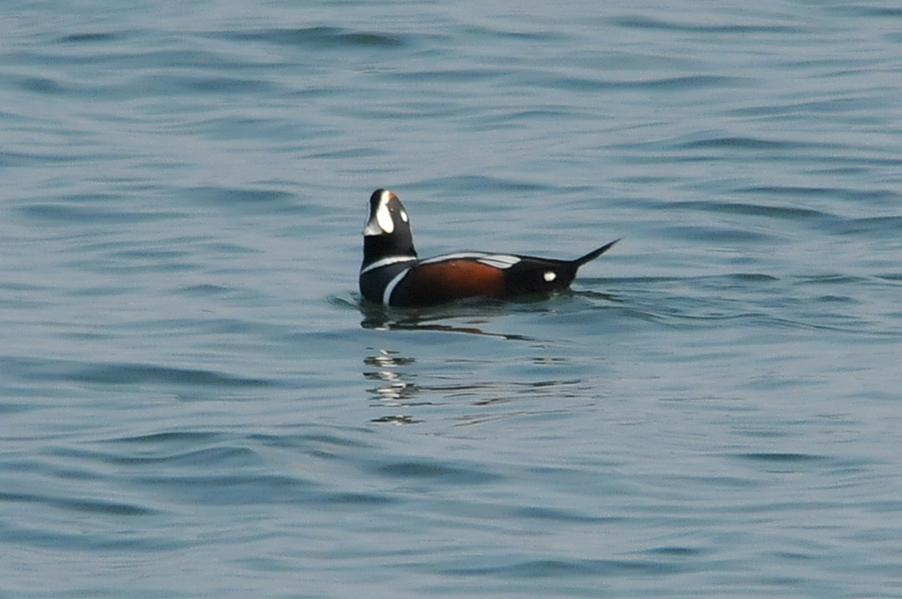 特 徴 :L43cm 体は丸く、嘴は小さく、尾が比較的長くて尖っている小型の海ガモ。雄の頭、背、胸、腹は紫黒色で、顔の前半、目の後