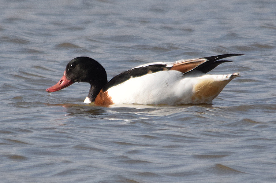 栗色。尾は白いが先が黒く、風切は黒く雨覆は白い。嘴は赤くて、繁殖期には基部にこぶがある。足は橙赤色。雌は全体に色が淡