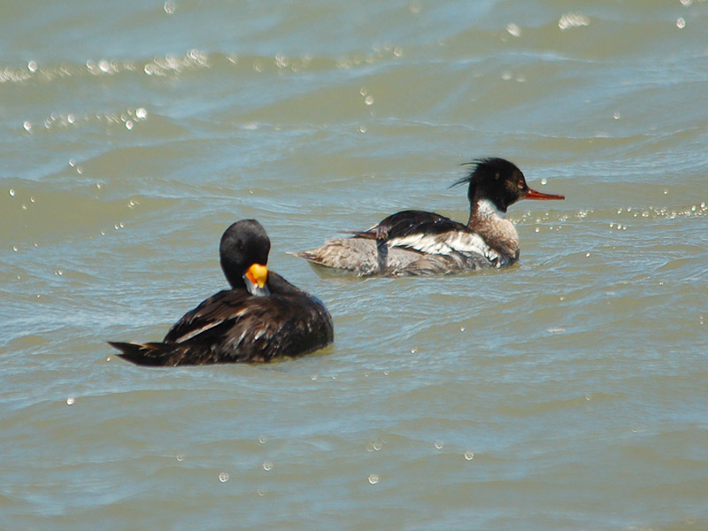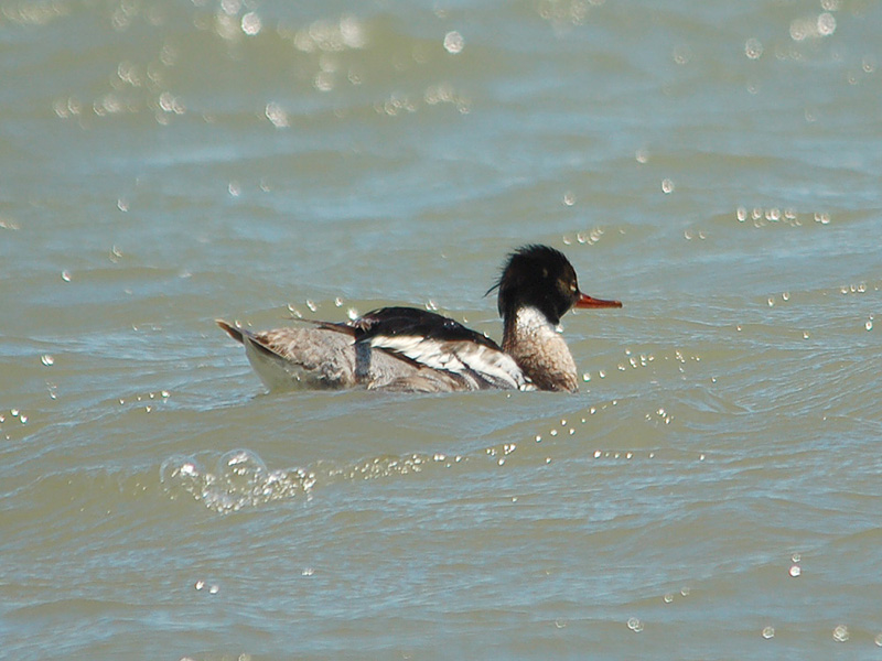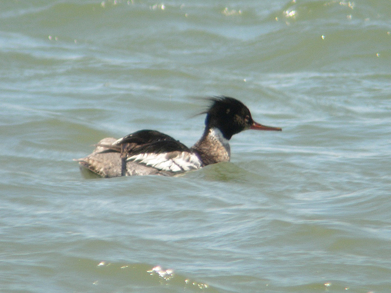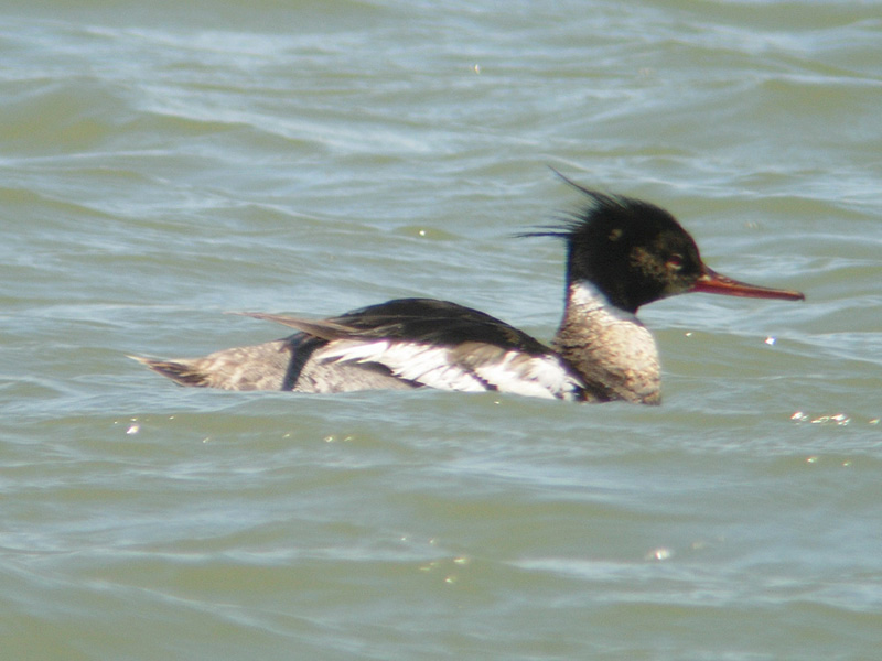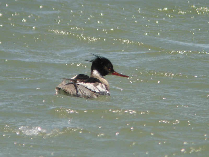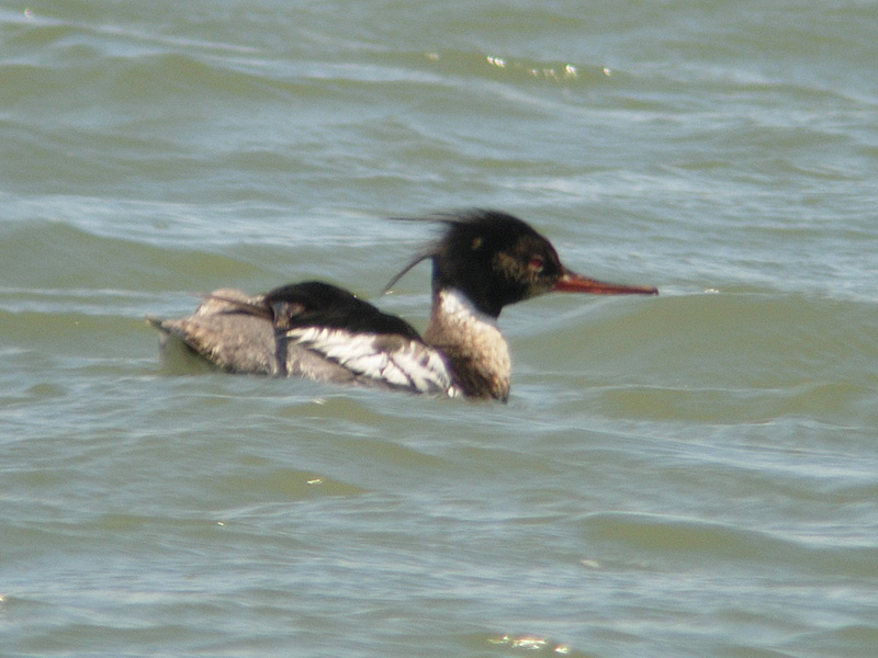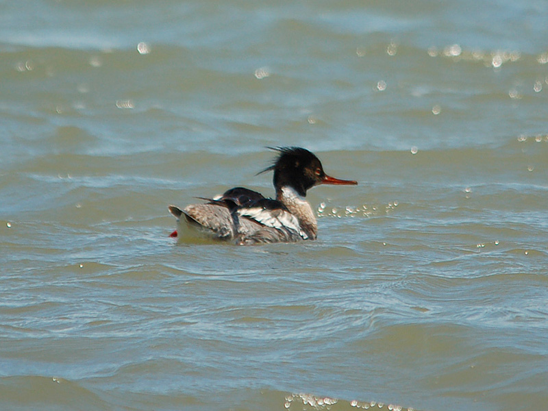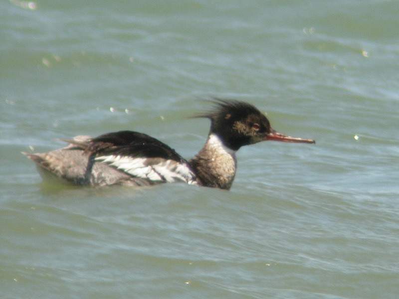 類 似 種:カワアイサの雄は冠羽が無く、胸もわきも白い。カワアイサの雌は少し大きくて、頭部の栗色味が強く、くびの白色部との境界が明