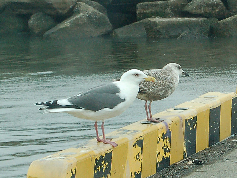 類 似 種:ワシカモメは背や翼の上面が青灰色で翼の先は濃灰色、目は黄褐色。若鳥は淡褐色で翼の先は褐色。オオセグロカモメは背や翼の上
