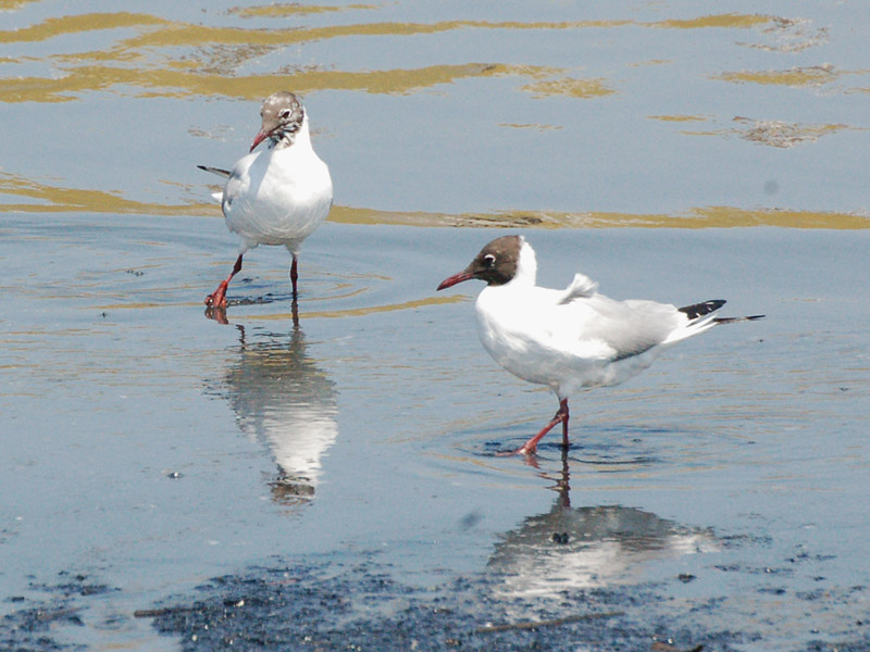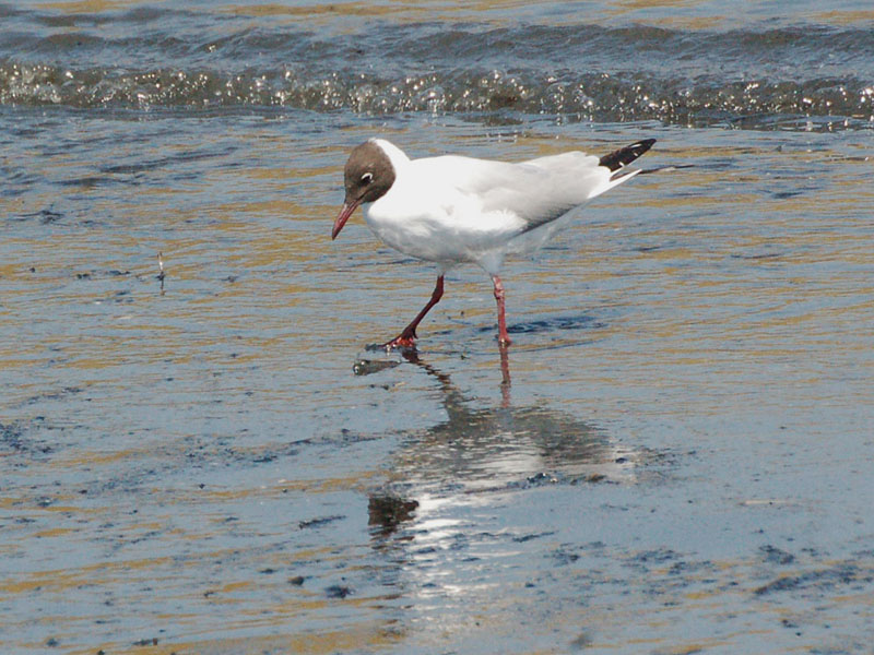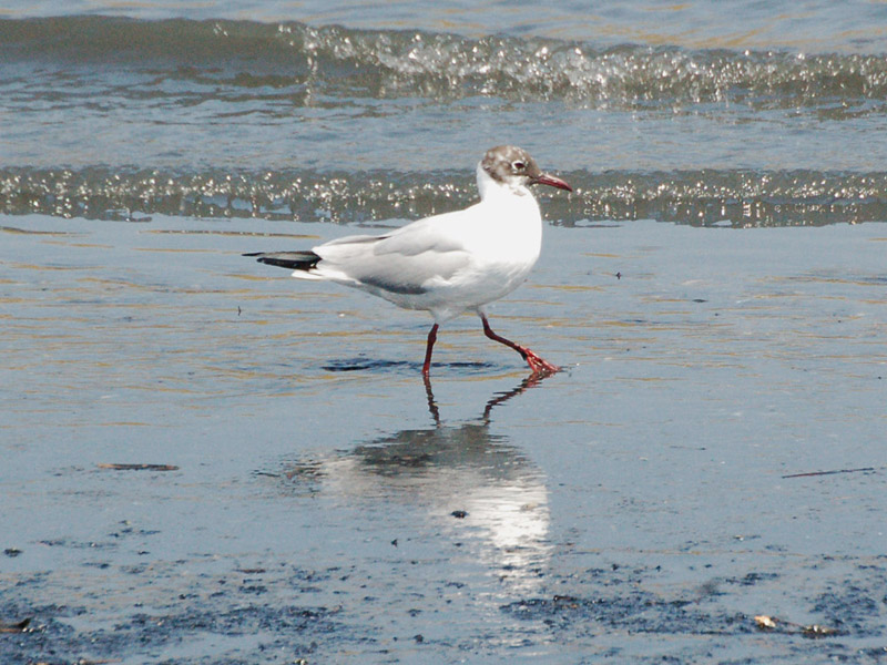 類 似 種:ズグロカモメの嘴は黒くて短く、翼の下面の黒色部は狭くて夏羽では頭部が黒色、翼の先の黒色部は点々と切れて見える。