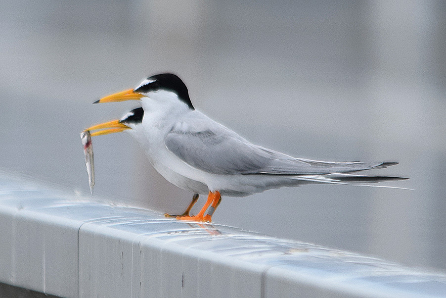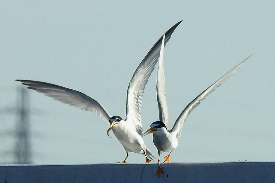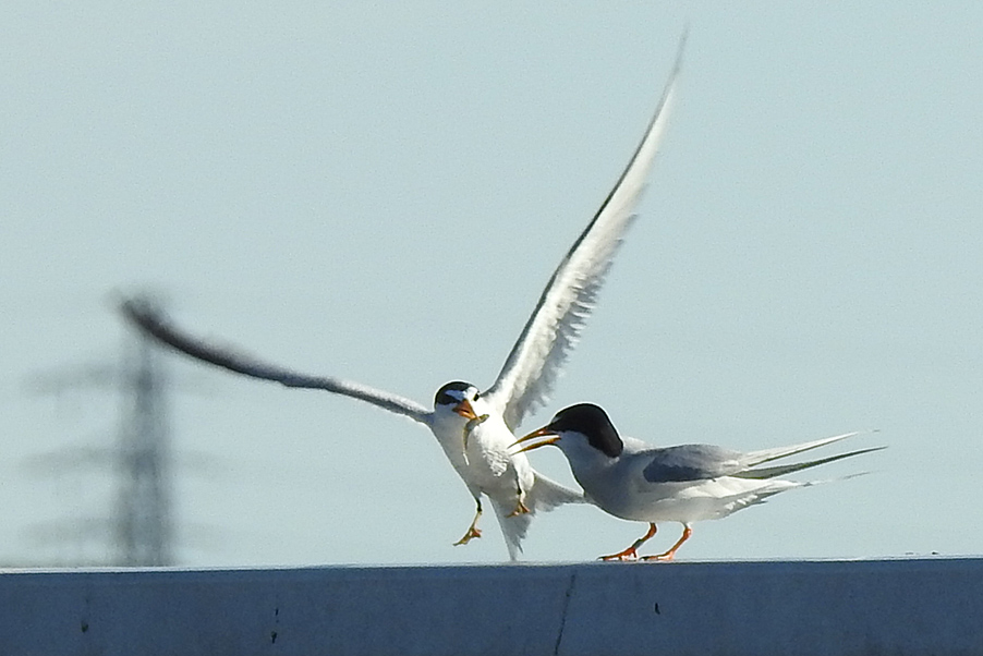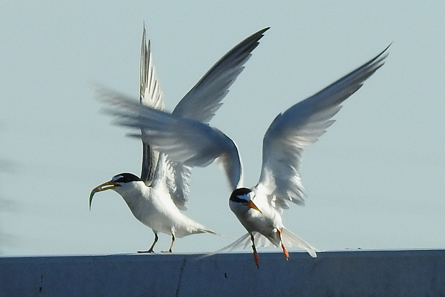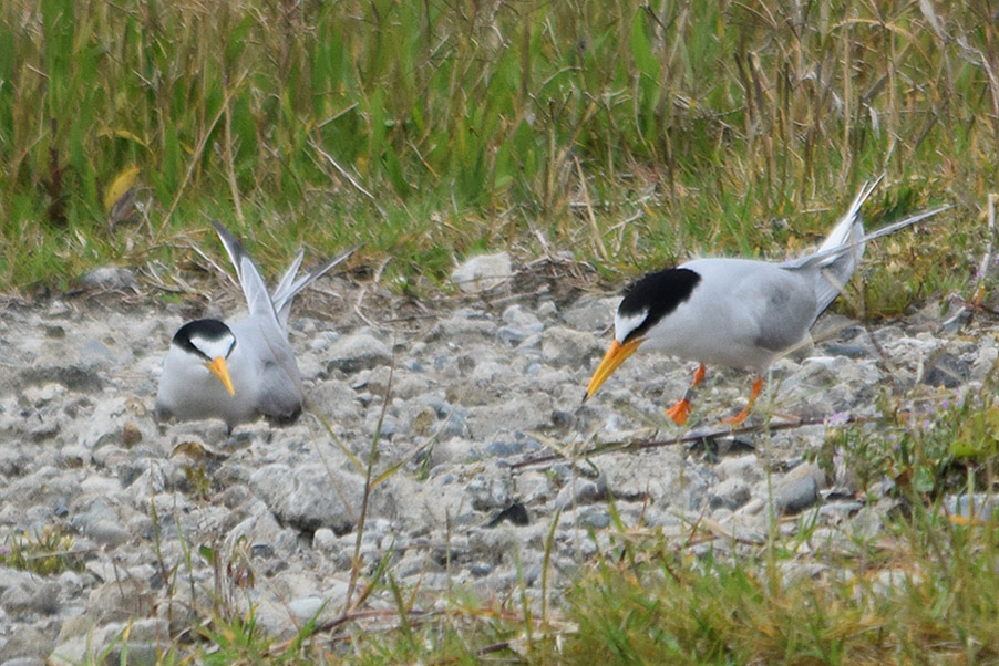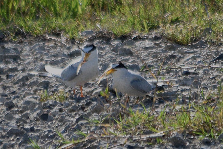足環付きのコアジサシと行動を共にしているアメリカコアジサシ。互いに相手を雌と看做しているようで、双方が 求愛給餌をしようとしています。