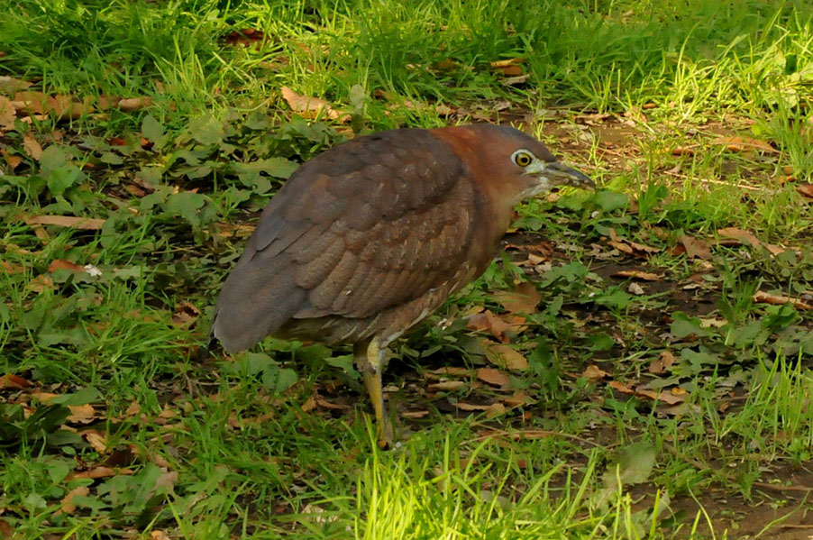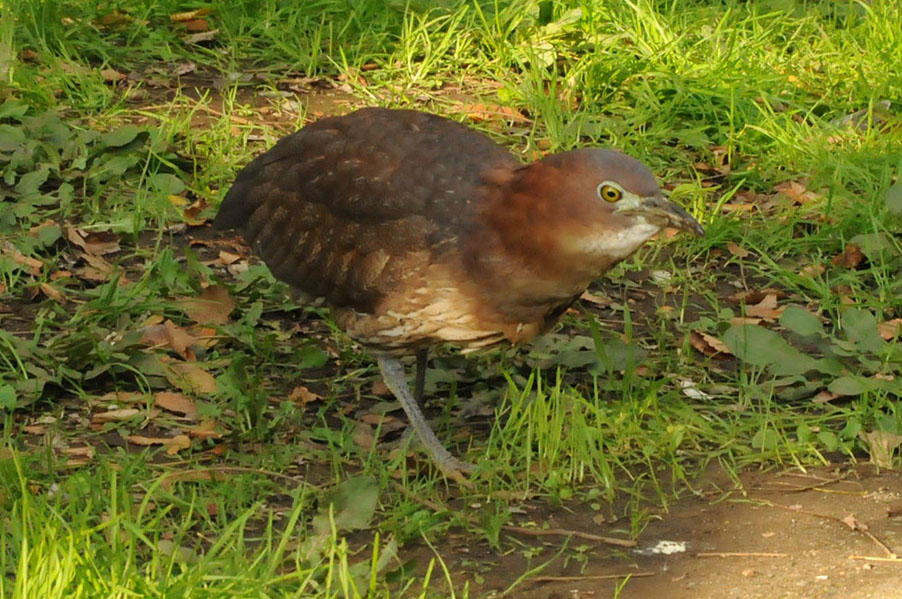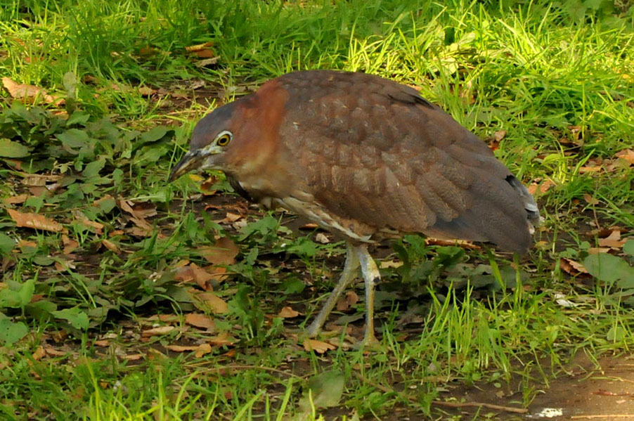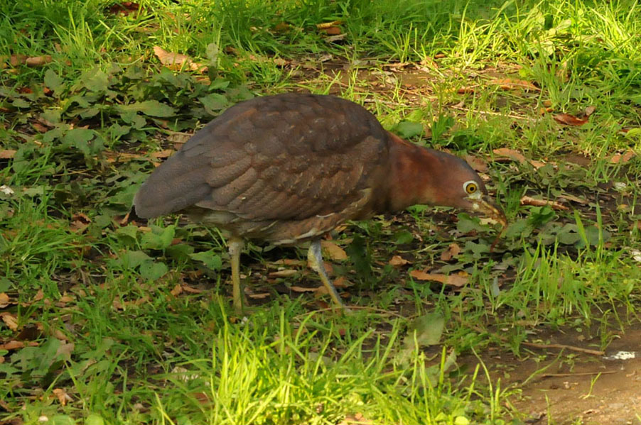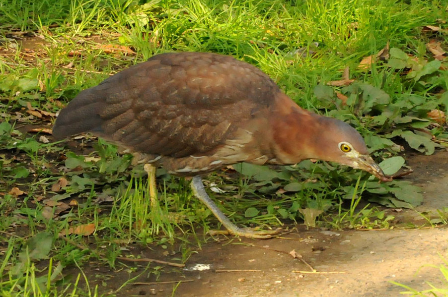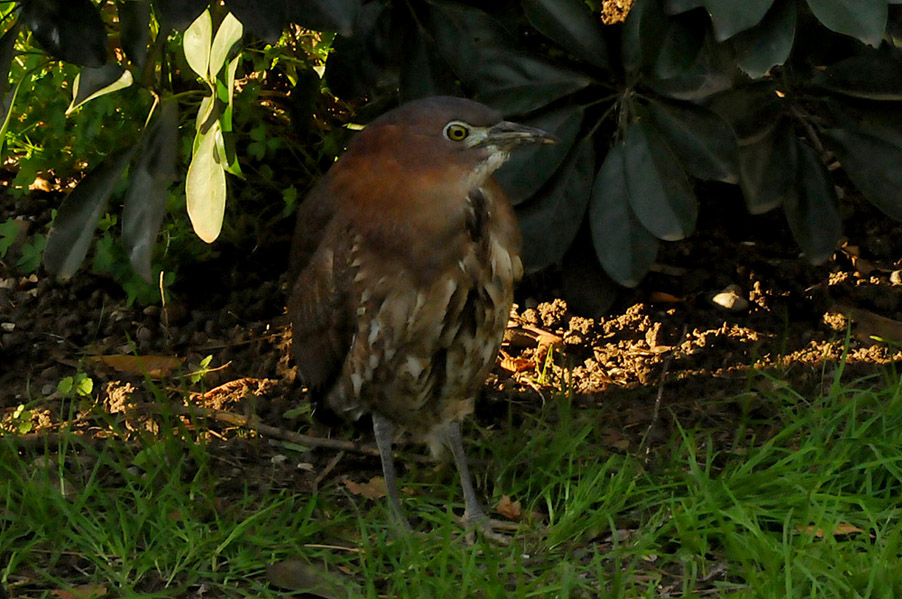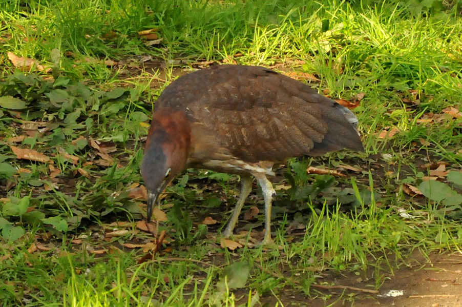 特 徴 :L49cm ゴイサギより小さく嘴は短い。頭上は赤栗色、体の上面は暗栗褐色。雨覆は栗褐色で風切が黒く、先端は栗色。体の下面