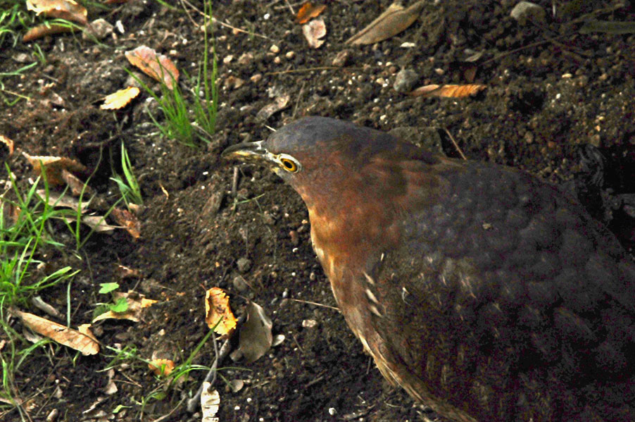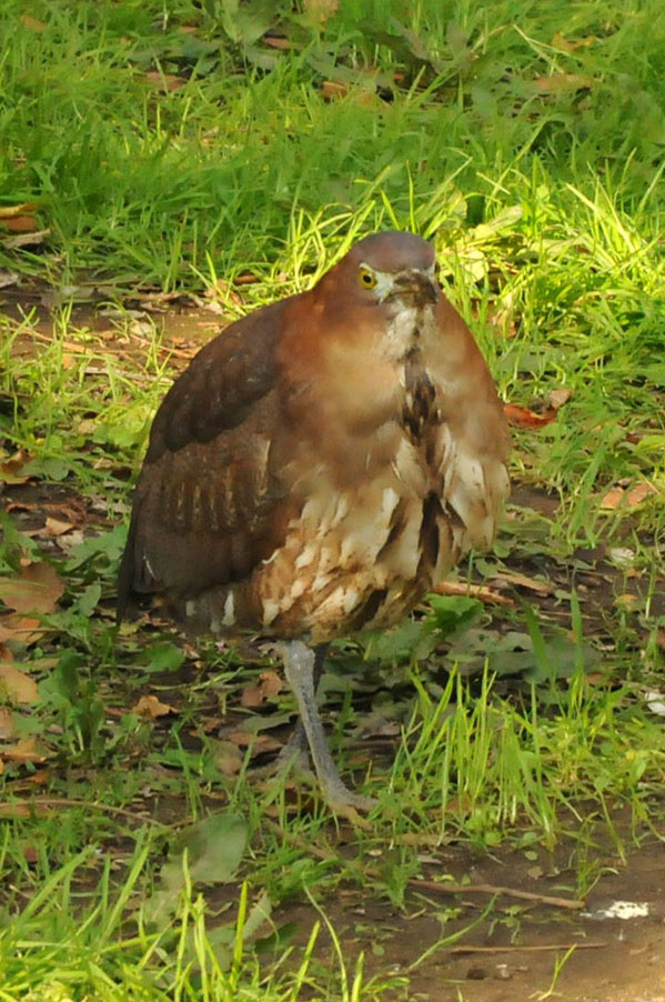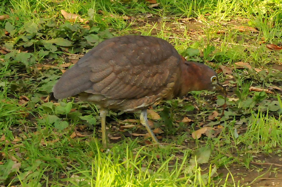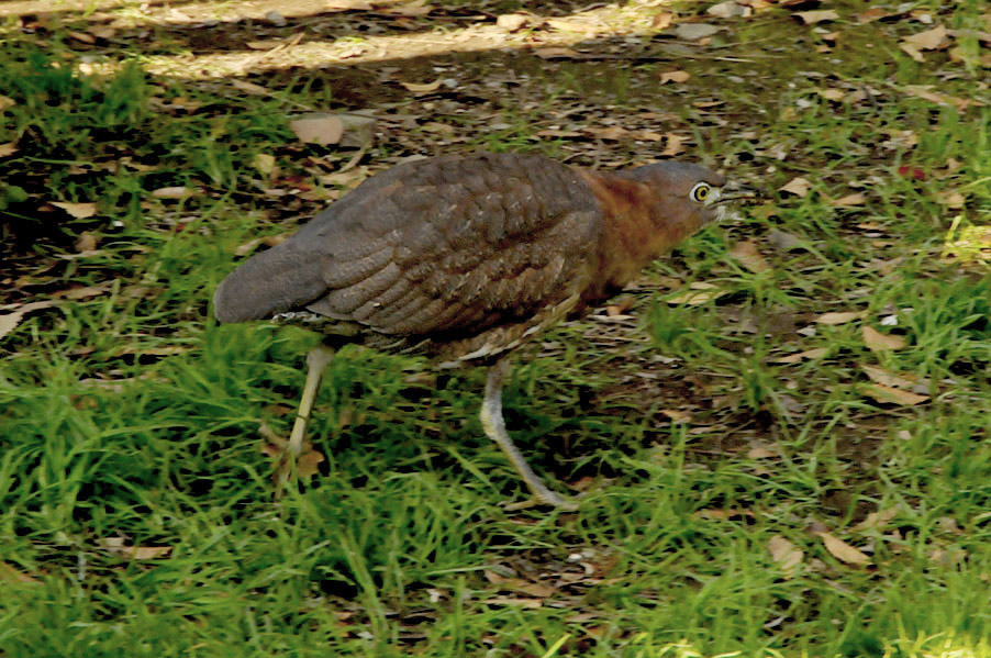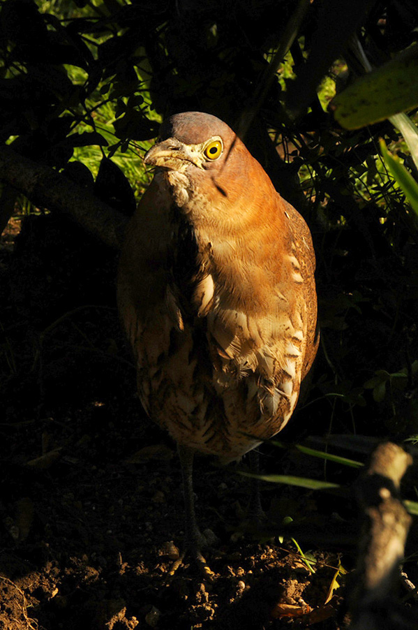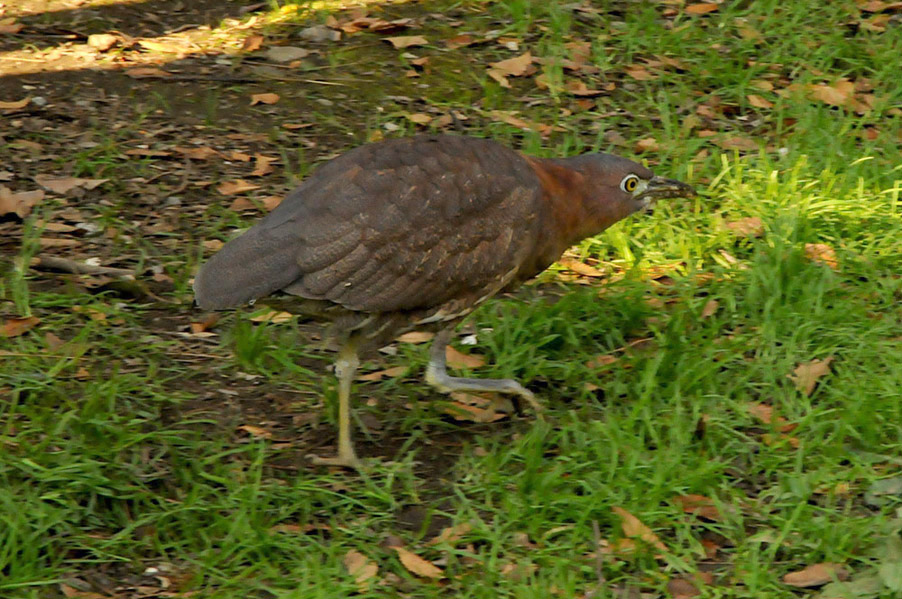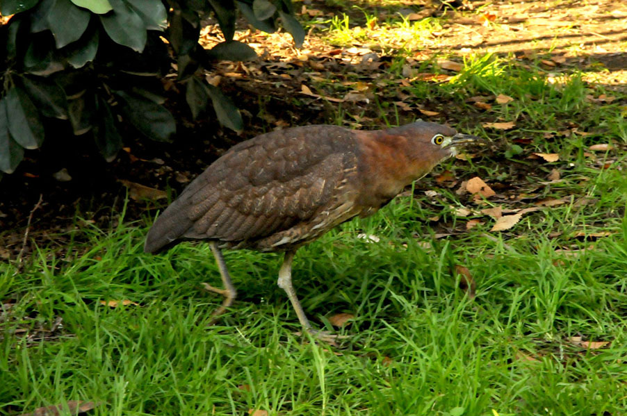 特 徴 :L49cm ゴイサギより小さく嘴は短い。頭上は赤栗色、体の上面は暗栗褐色。雨覆は栗褐色で風切が黒く、先端は栗色。体の下面