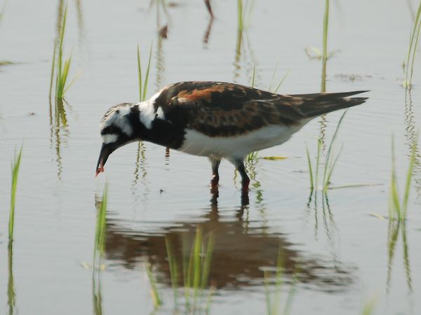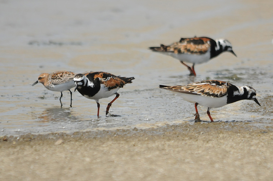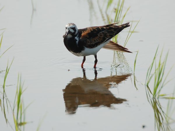特 徴 :L22cm 嘴は短くて上に反り、赤い足は短い。夏羽では頭部から胸は白地に特徴のある黒い縞模様があり、体の上面は赤褐色、黒