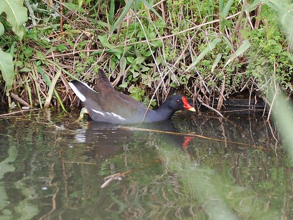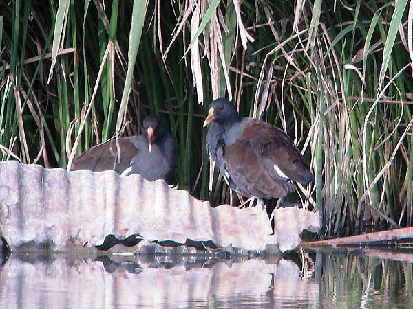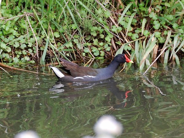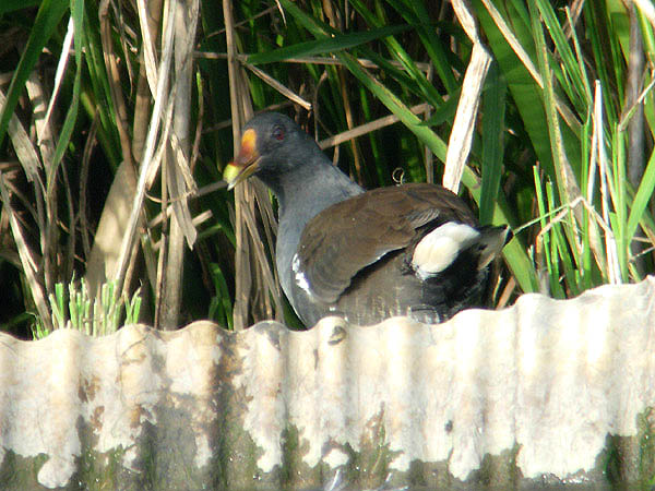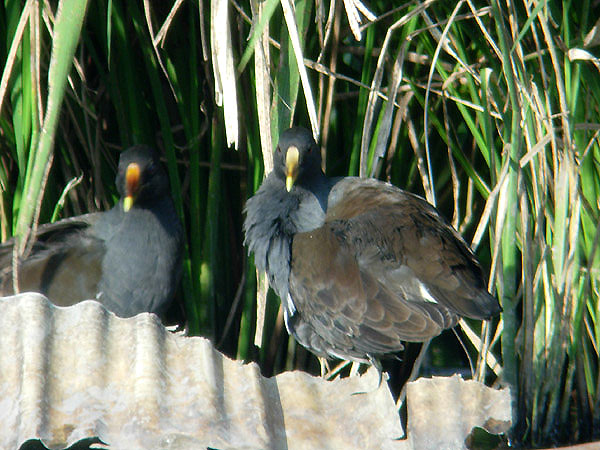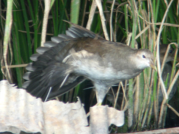 類 似 種:オオバンは黒くて嘴と額板が白く、飛ぶと翼の後縁に白線が出る。オオバンの幼鳥はバンの幼鳥より黒褐色味が強い。クイナは脇や