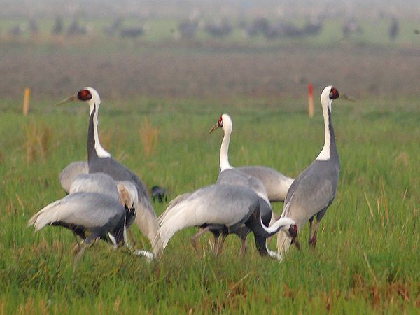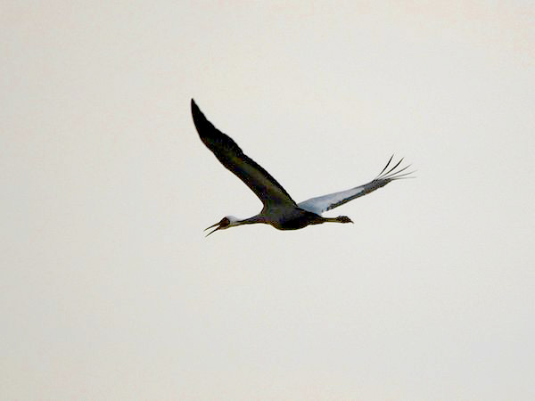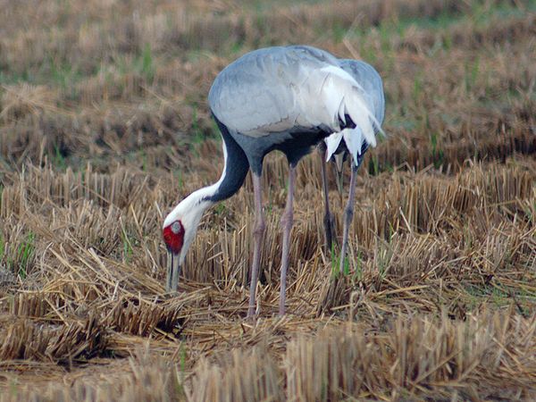 類 似 種:ナベヅルは小さくて体と翼が黒く、足も黒い。クロヅルは頭部が赤く、くびに黒色部があり、足は黒い。アネハヅルは小さくて、く