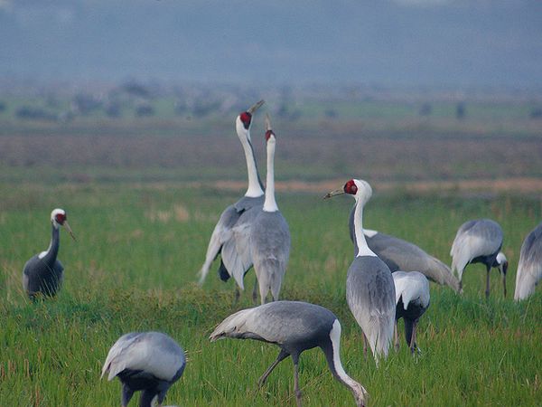 声 :ナベヅルによく似て、クルルと鳴く。また雄と雌が向かい合ったり並んだりして、雄は翼を垂らして上下に動かしながらクッ、クル